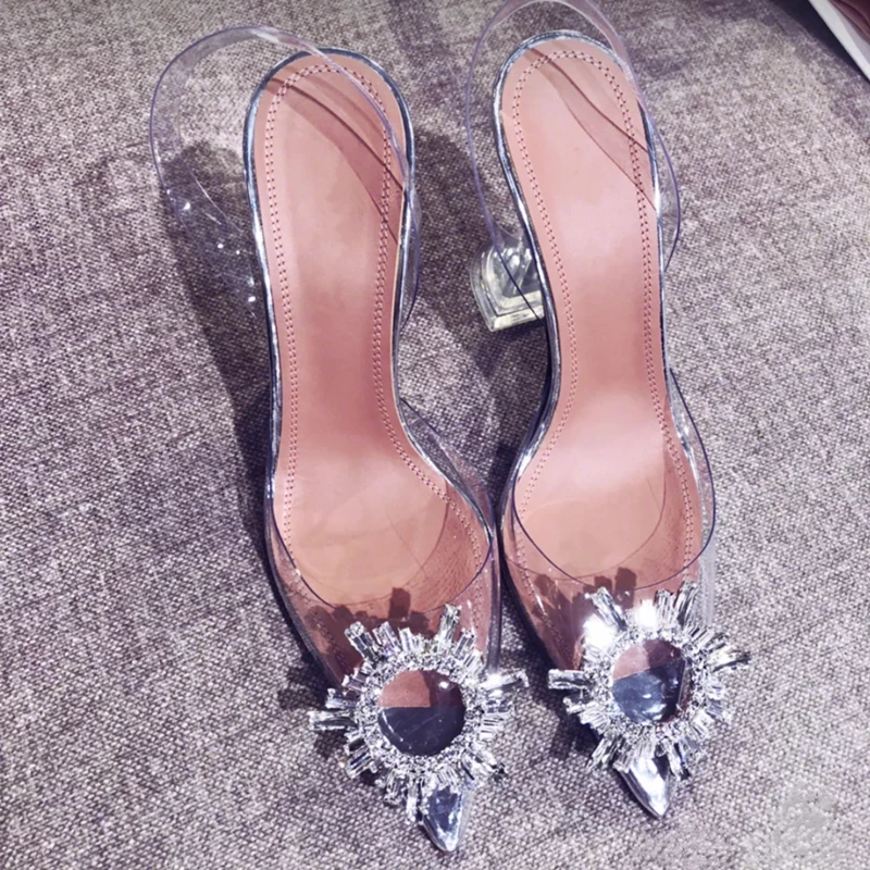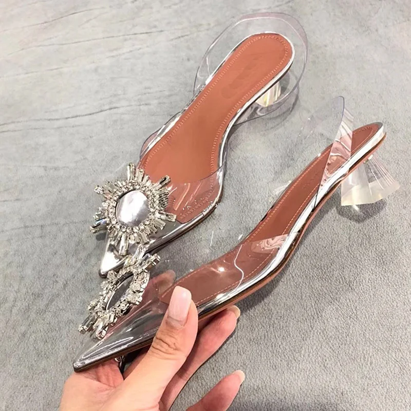 Star style Women sandals Elegant Pointed toe Rhinestones High heels Wedding Shoes Crystal Clear heeled Slingback Pumps Sandals