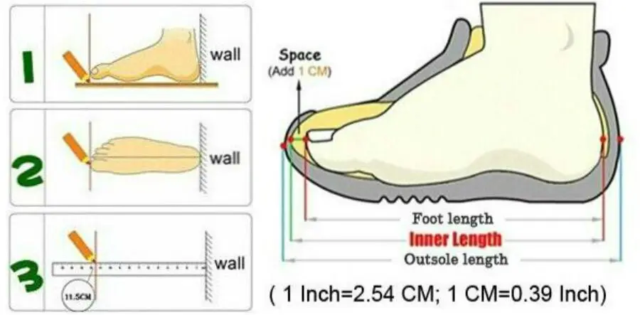 A:There is currently no uniform size in the world.Europe 40 does not equal China 40. Please measure the length of the foot before purchase.(Note: Do not measure the length of the foot directly. This can lead to many errors. Please put your feet on white paper. Draw the front end and back end of the foot on white paper, which is the length of the foot.)If your feet are 25 cm long and then +0.5 cm (active space), choose 25.5 cm. The feet are very fat or very wide +1 cm.