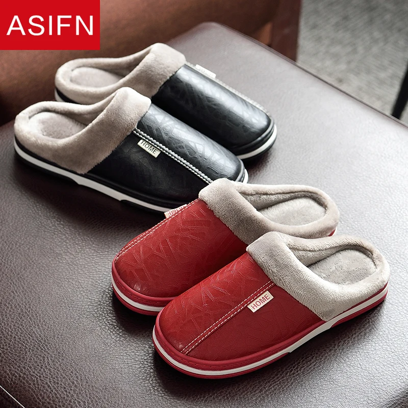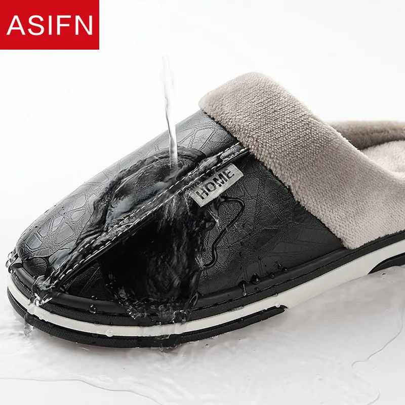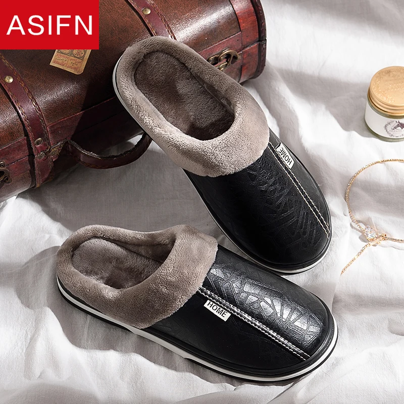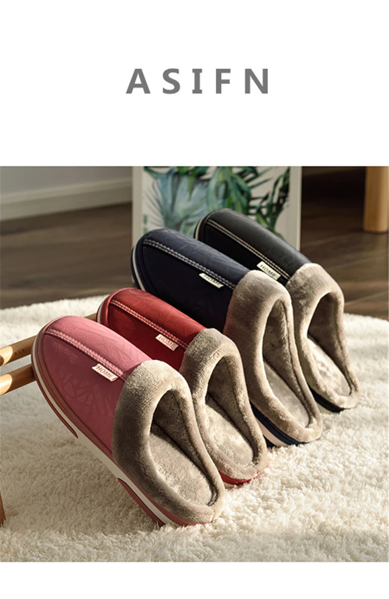 | ASIFN Men Slippers Indoor Leather Winter Waterproof Warm Home Fur Women Slipper Male Couple Platform Shoes Fluffy Big Sizes |