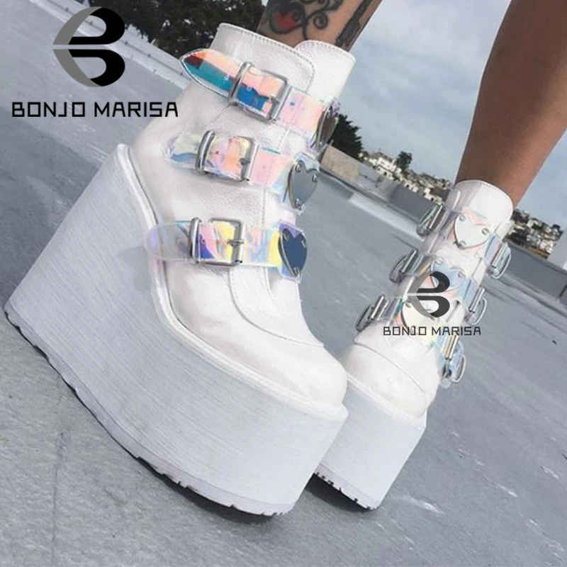 BONJOMARISA Dropshipping INS Hot Brand High Platform Ankle Boots Women 2020 Fashion PVC Strap Decorating High Wedges Shoes Woman