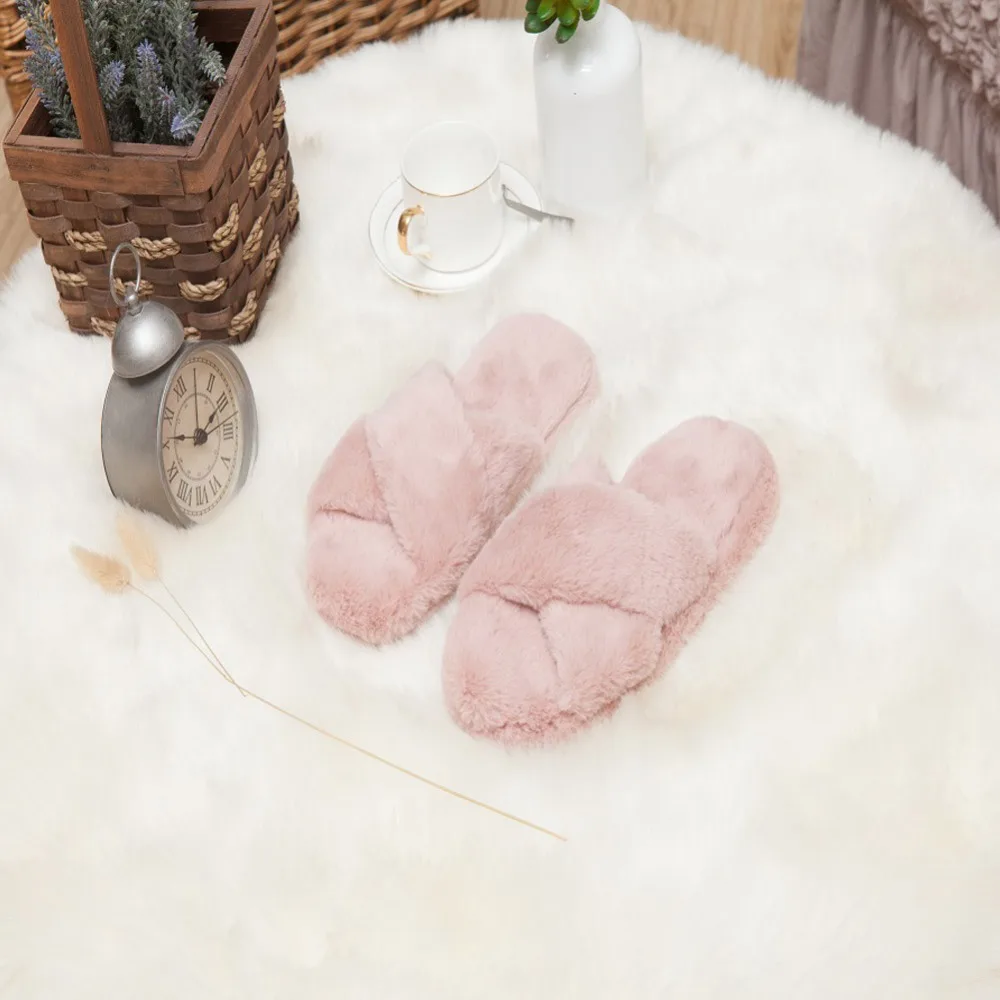 Winter House Women Fur Slippers Fashion Cross Band Warm Plush Ladies Fluffy Shoes Cozy Open Toe Indoor Fuzzy Slides For Girls